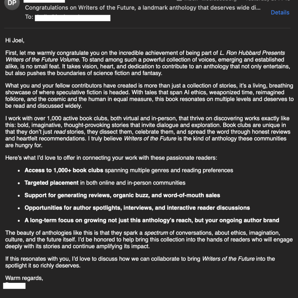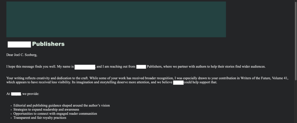 One of the things that surprised me after my story was published in Writers of the Future, was how quickly I was targeted by marketing scams. And, even in the few months I’ve been getting such emails, they are getting increasingly sophisticated. I just wanted to use this blog post to flag this as a warning to anyone else who has received similar messages.