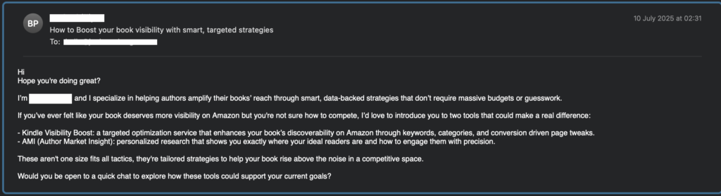 I thought it was odd that a marketer / marketing company would use a private gmail address, rather than a company email, to contact prospective new clients. Nonetheless, being very polite and also not wanting to come across as obnoxious to anyone that was sincerely looking to help me, I replied and said “thank you very much but the publisher is handling all the marketing”.